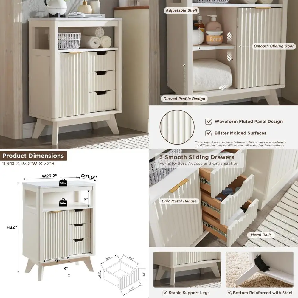 contemporary sliding door cabinet for bathroom, fluted drawers storage with adjustable shelf and faux marble top