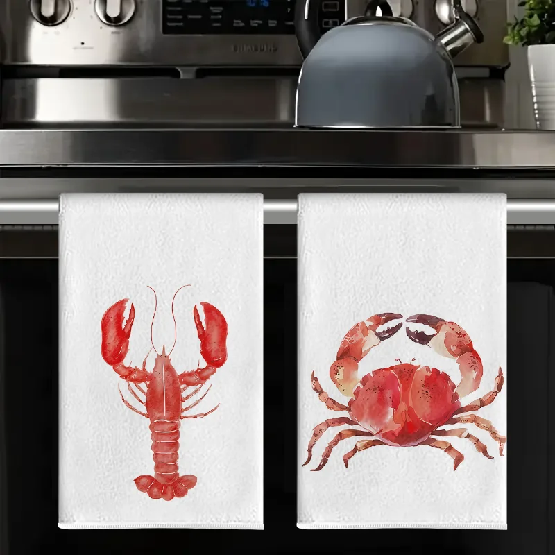 2Pcs, Watercolor Lobster and Crab Style Kitchen Towels, 40Cm*60Cm Towel Set, Super Absorbent Soft Cleaning Cloth, Cooking and Baking Tea Towel, Tea Towel, Hand Towel, Cleaning Cloth, Dishcloth,