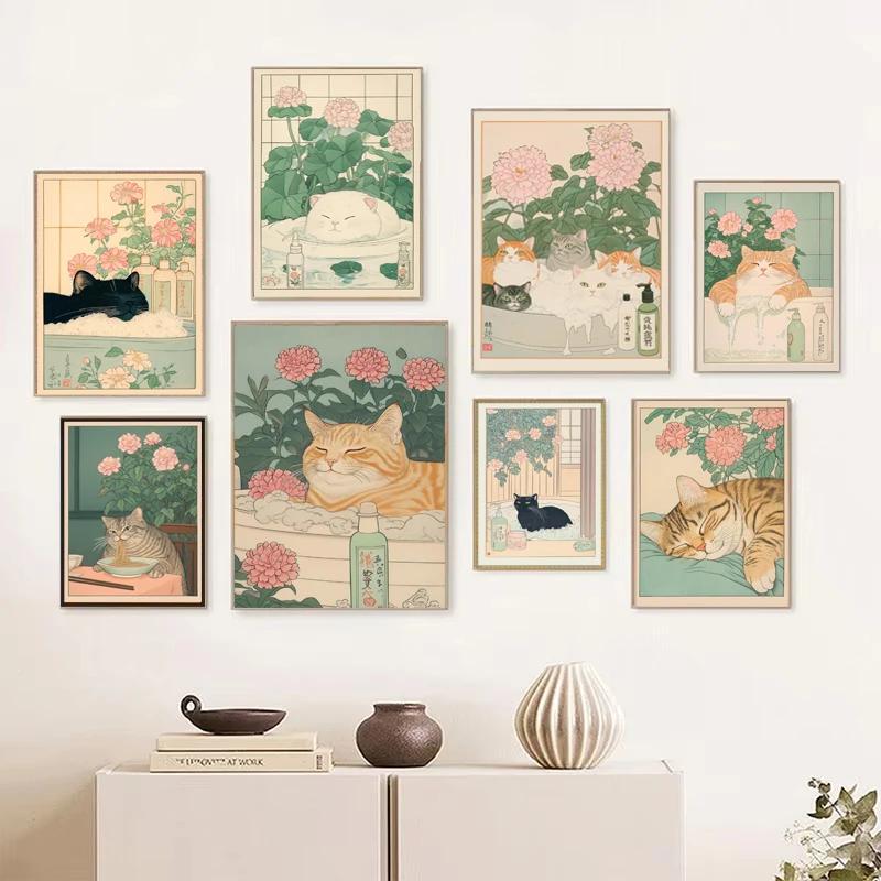 Japanese Tabby Cat in Bathtub Poster Prints Canvas Painting Retro Aesthetic Wall Art Picture Japandi Bathroom Toilet Home Decor  Read more
