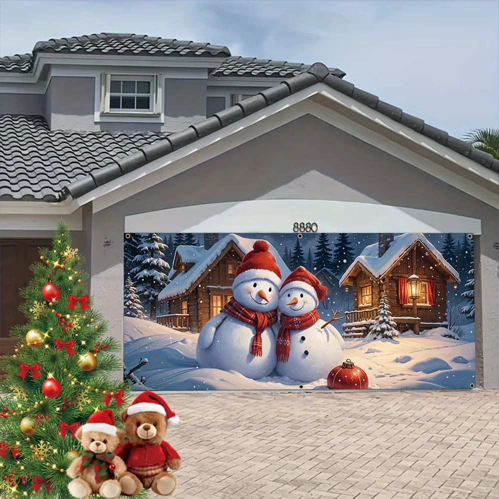 1, Christmas garage door banner, durable polyester, snowman and snow scene, Christmas tree design, outdoor holiday decoration