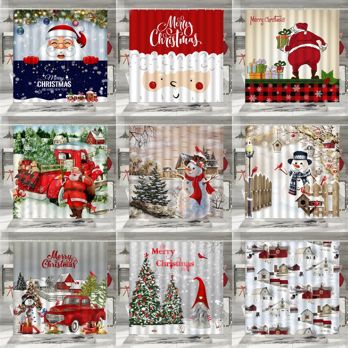 Christmas Shower Curtain, Winter Snowman Father Christmas Farmhouse Truck Snowflake Christmas Tree Red Bird Bathroom Decoration  Read more