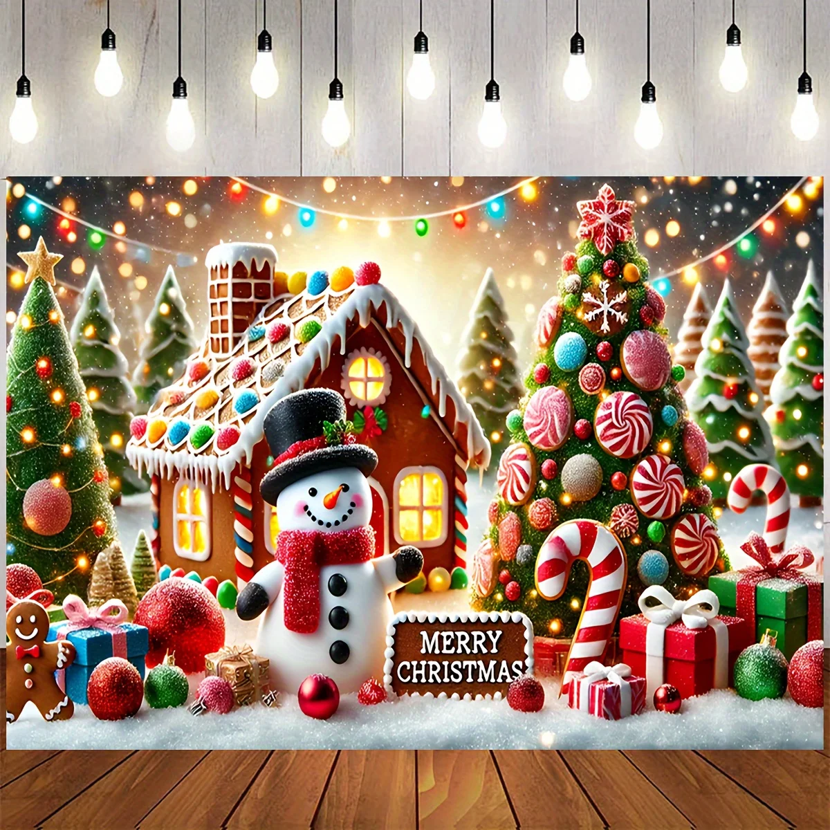 1pc 2D flat Christmas background cloth, including gingerbread house, candy cane, Christmas tree, and snowman