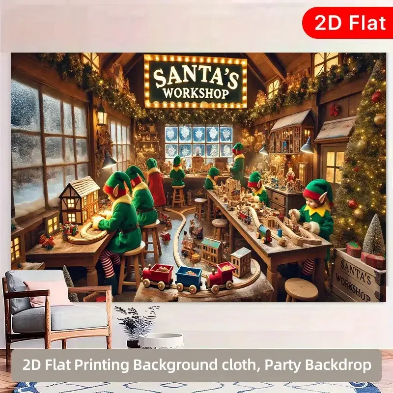 1pc2D flat, Christmas workshop elf working background banner for home, party, studio and office decoration, no power required ws