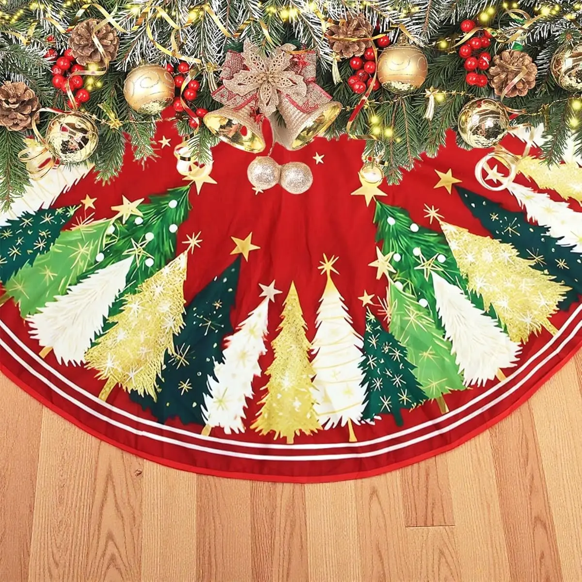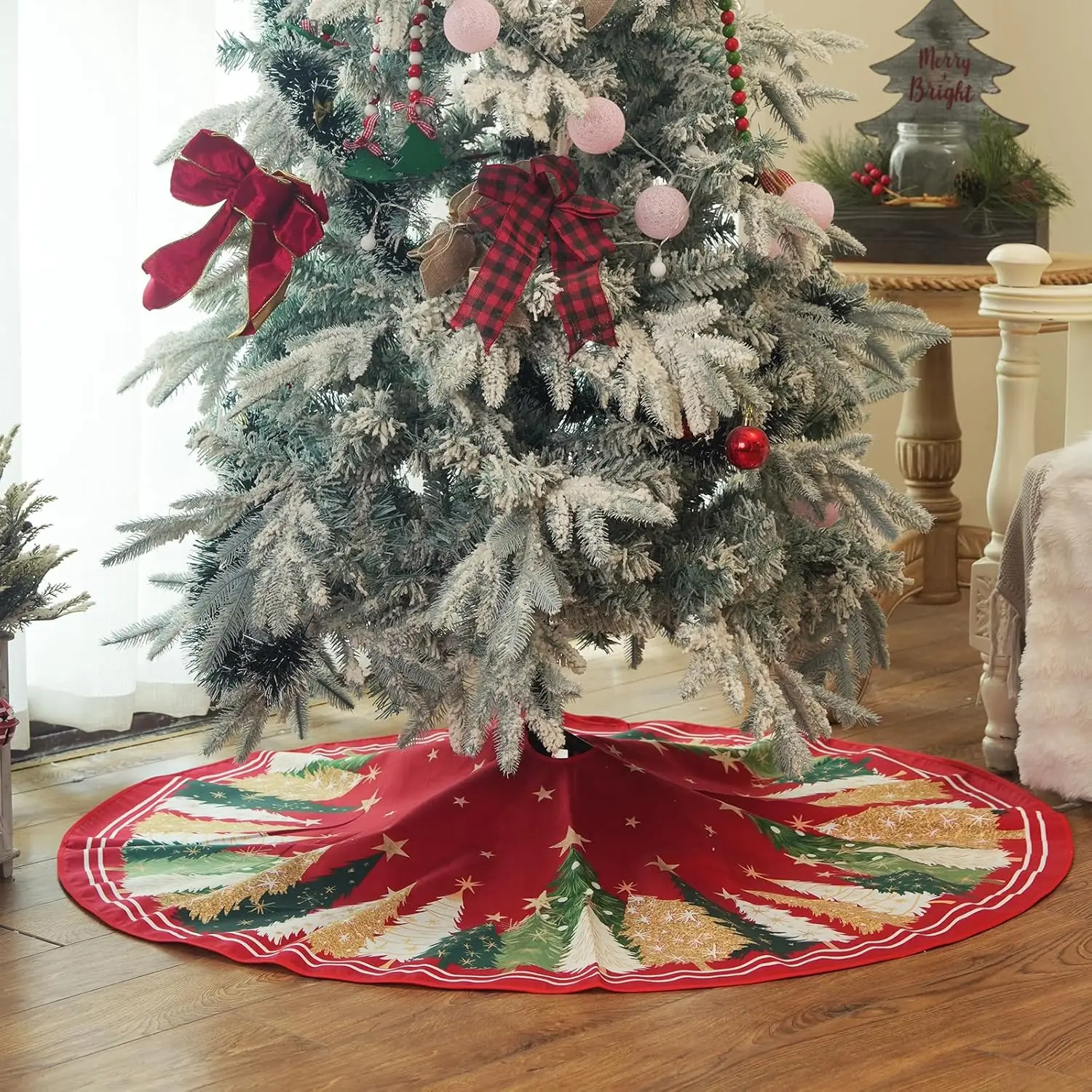VIKAMA Christmas Tree Skirt with Red Base and Christmas Tree Design Farmhouse Holiday Party Home Gathering Decor
