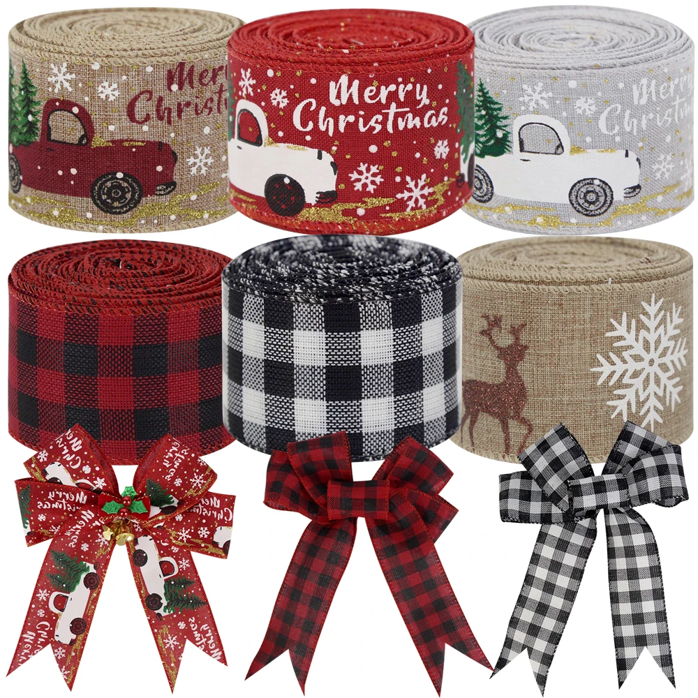 Christmas Burlap Ribbon Roll Xmas Tree Twine Streamer Ribbon Car Truck Red Plaid Tape for Christmas Gift Wrapping DIY Bow Craft
