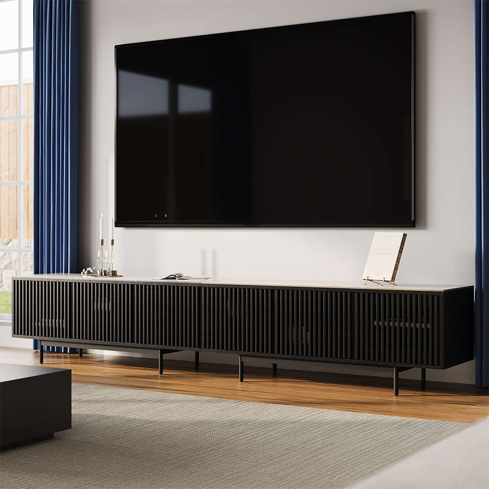 118.11"Mid-Century Modern Glossy Sintered Stone Tabletop TV Stand, Slatted Door TV Console, Black Media Console