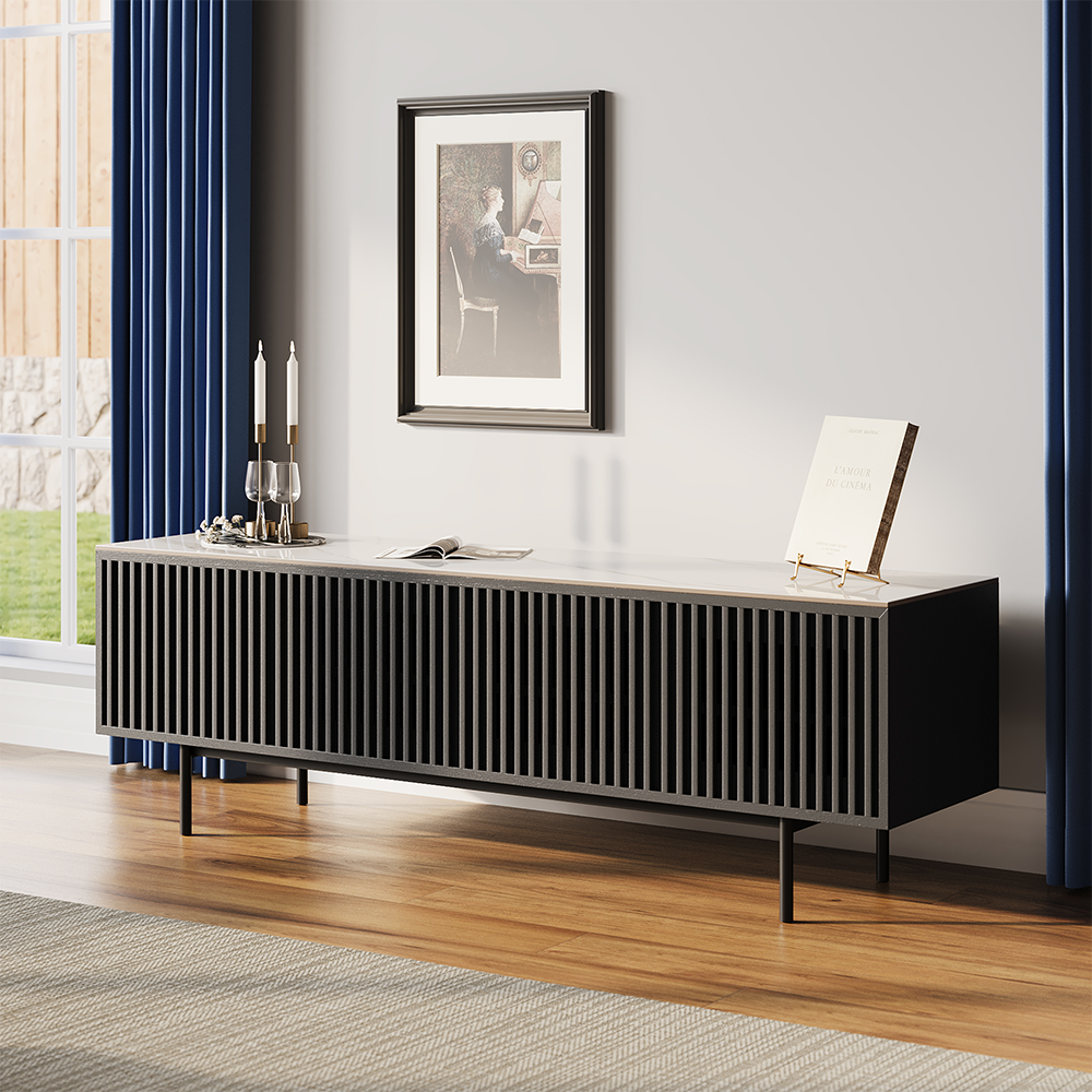 70.87"Mid-Century Modern Glossy Sintered Stone Tabletop TV Stand, Slatted Door TV Console, Black Media Console