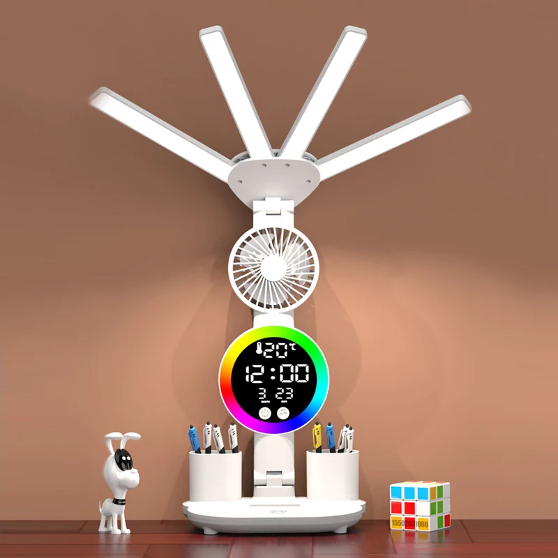 Multifunction 3 Color LED Table Lamp Four Headed Folding With Fan Clock Desk Lamp USB Charging Reading Night Light