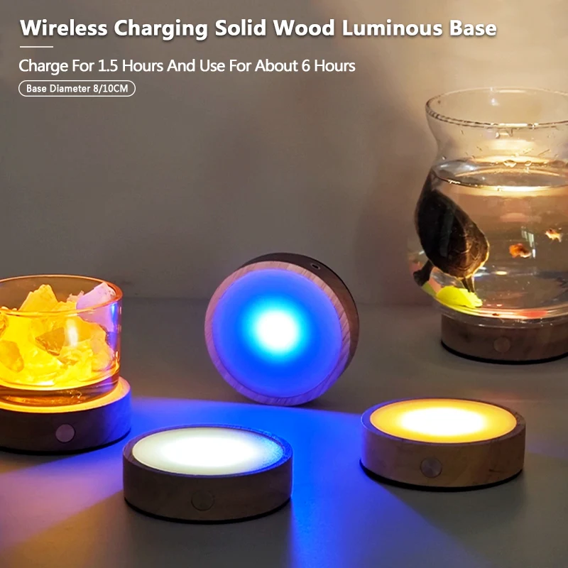 Wireless Charging Solid Wood Luminous Base Night Light Touch LED Crystal Wine Bottle Fish Tank Coaster Small Desk Lamp Base
