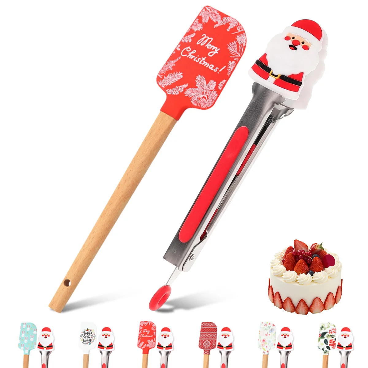 Christmas Silicone Spatula and Kitchen Tongs, Silicone Pliers with Unique Design, Spatulas with Wooden Handle, Kitchen Supplies