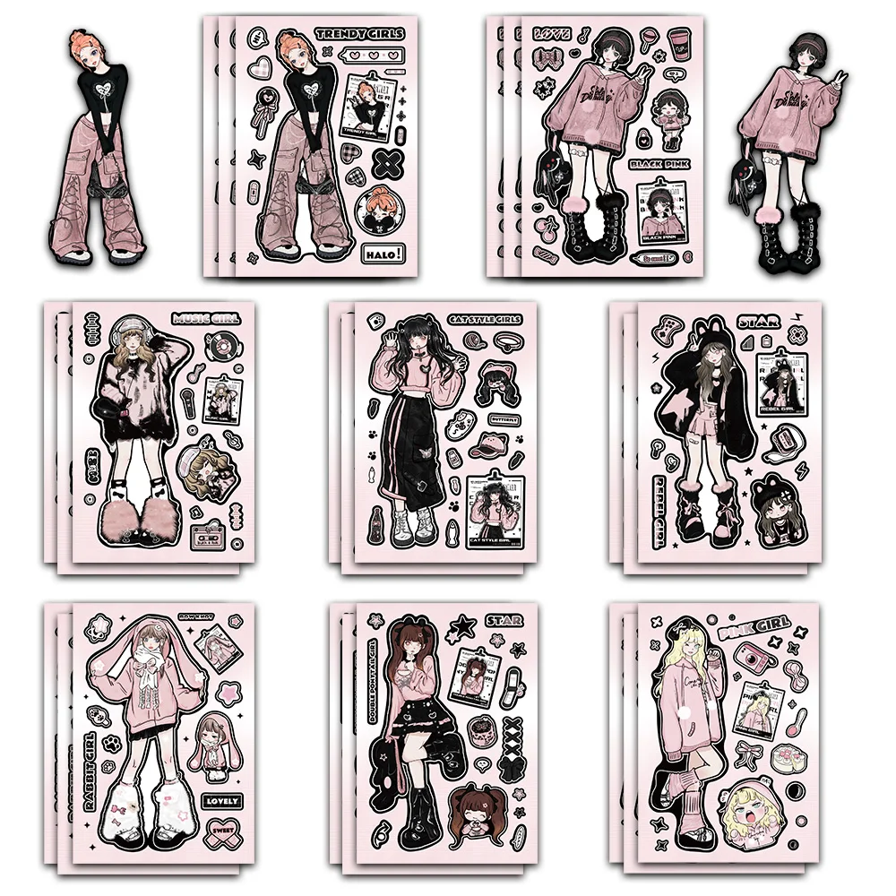 8PCS Cartoon Beautiful Hong Kong style Retro/Black Pink Girl Collage Scrapbooking Collage Material Phone Case Guitar Decorative  Read more