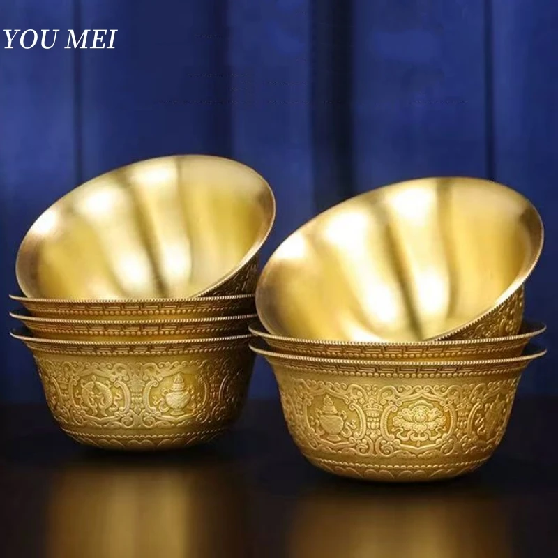 Buddhism Hall Altars Bowl, Engraving Eight Auspicious Brass Bowl, Tibetan Golden Holy Cup Buddhist Religious Item Decorative