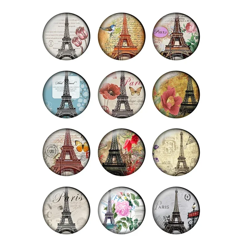 12pcs 24different Style Round French Paris Eiffel Tower Bird Flower Pattern Glass Cabochon Gems for DIY Jewelry Finding T079