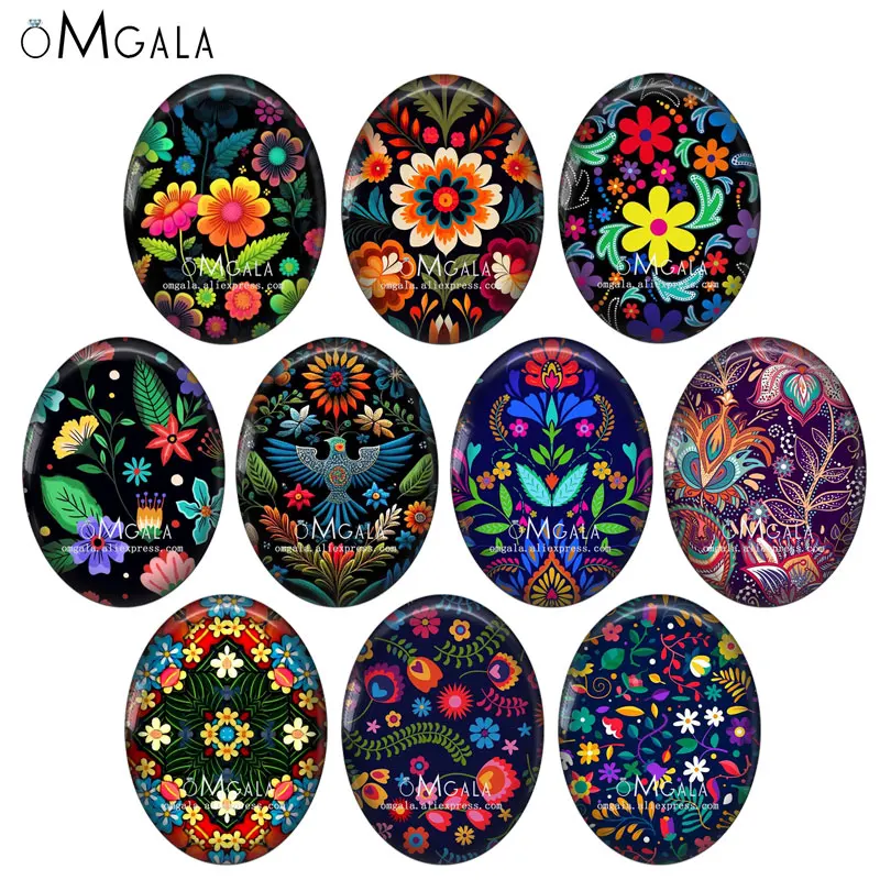 Black Background Colorful Folk Flowers 10pcs 13x18mm/18x25mm/30x40mm Oval photo glass cabochon demo flat back Making findings