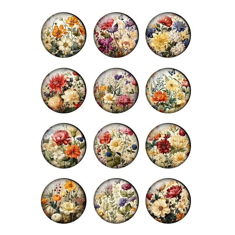 12pcs/lot Vintage Colorful Flower Art Patterns 8mm/12mm/20mm/25mm Round Photo Glass Cabochon Demo Flat Back Making Findings T213