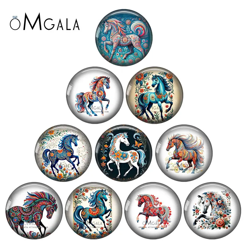 Folk Art Flowers with Horse Pattern 12mm/18mm/20mm/25mm Round Photo glass cabochon demo flat back Making findings