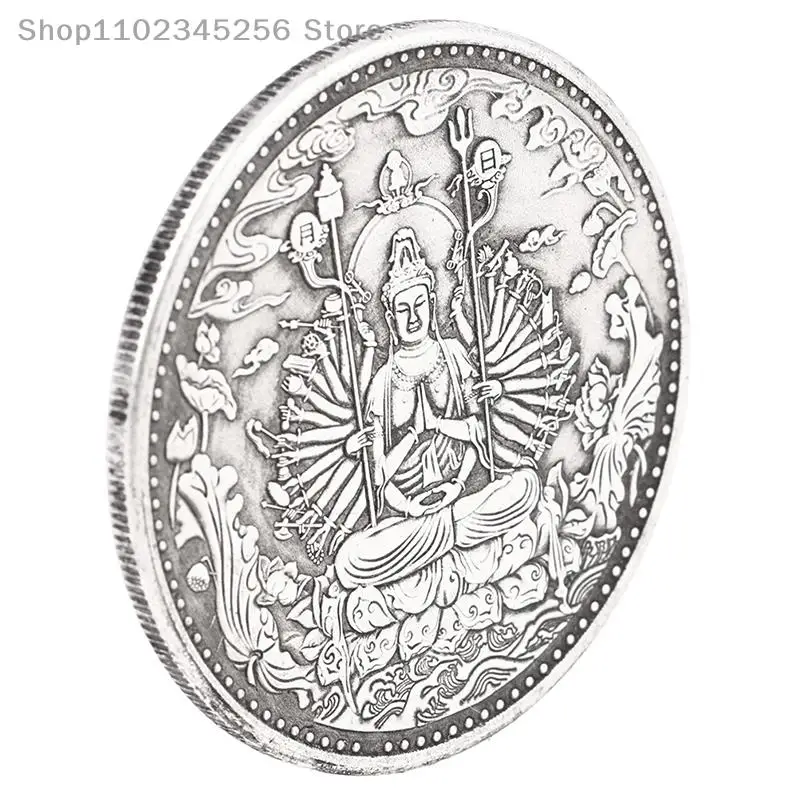 1PC Tibet Silver Ancient Coins Collection Buddhist Thousand Hand Guanyin Heart Sutra Buddha Statue Auspicious Ornament Gift
