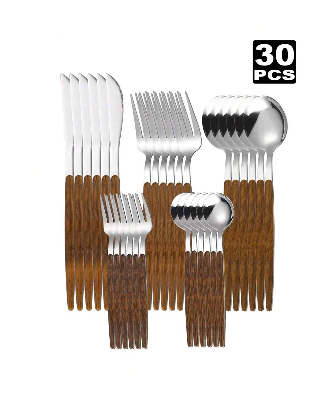 5/20/30pcs Stainless steel cutlery set, Portuguese imitation wood grain plastic handle cutlery, suitable for kitchen, hotel