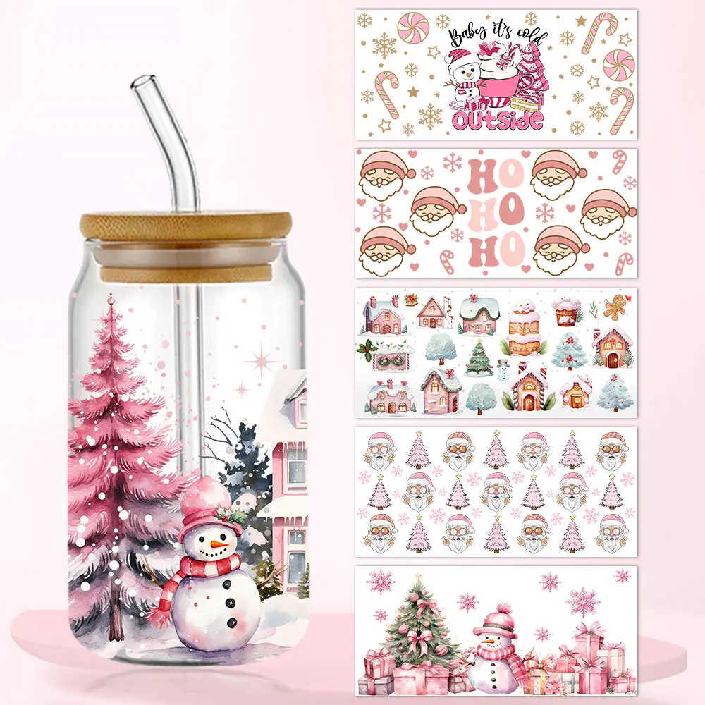 Pink Christmas UV DTF 16oz Cup Wrap Libbey Glass Plastic Can Wraps Selfadhesive Sticker Ready to Ship Without Cup