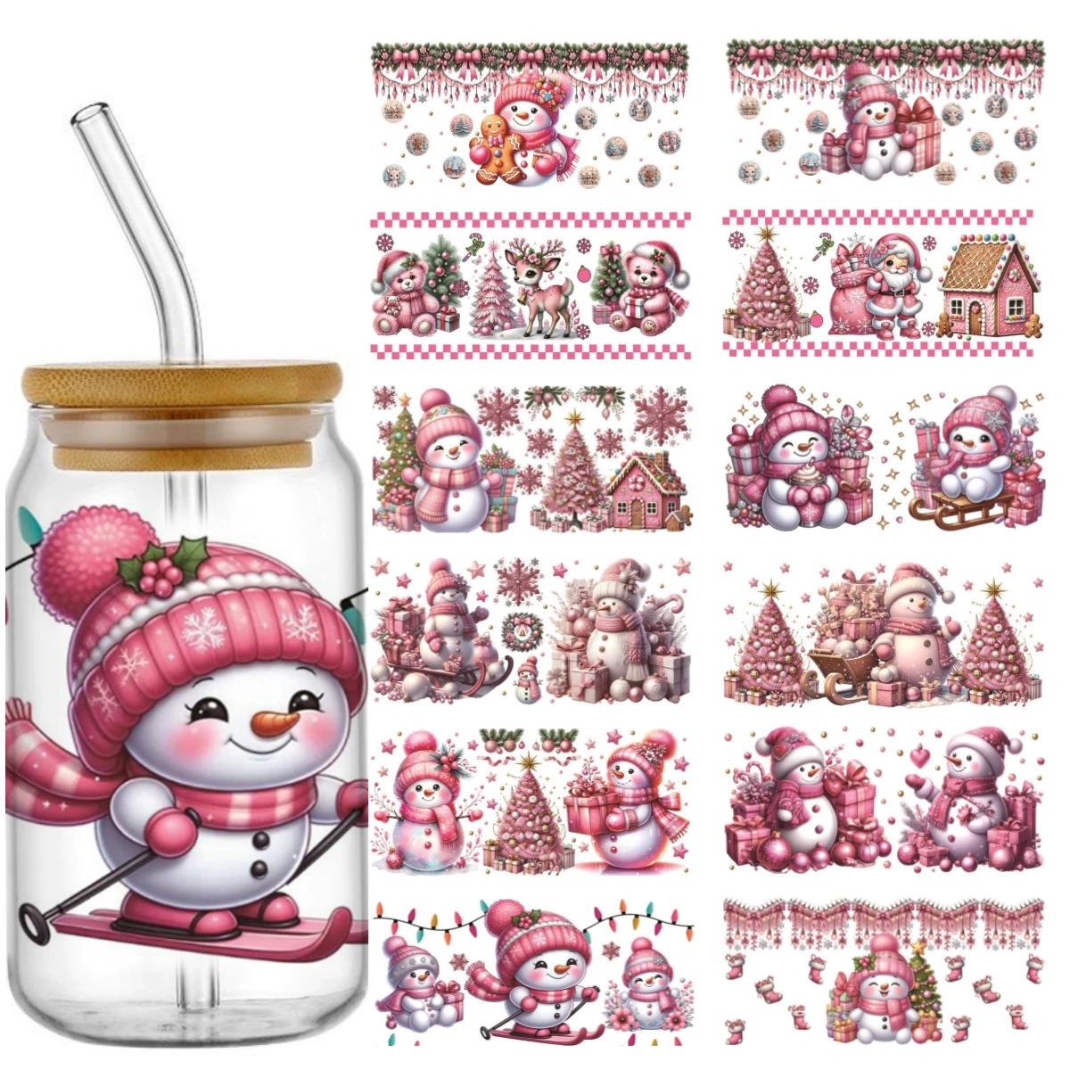 Pink Christmas Cute Snowman UV DTF 16oz Cup Wrap Libbey Glass Plastic Can Wraps Selfadhesive Sticker Ready to Ship Without Cup