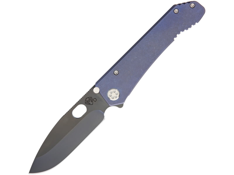 Medford 187 DP Framelock Folding Knife 4.25in Black Pvd Coated D2 Tool Steel Drop Point Blue Anodized Titanium Handle Thumb Pull Thumb Stud Pocket