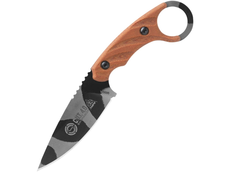 TOPS Knives CUT Combat Utility Tool Knife 8.5in Overall 4.25in Camo 1095Hc Steel Blade Tan Canvas Micarta Handle Finger Ring Dragonfly Tread Handle