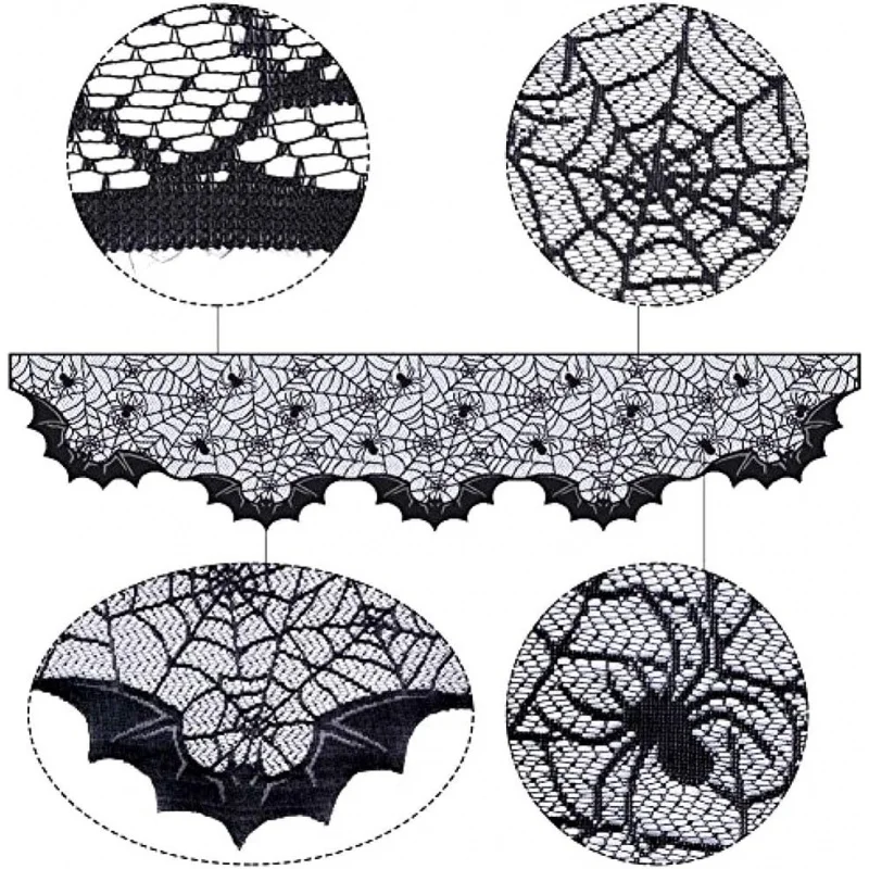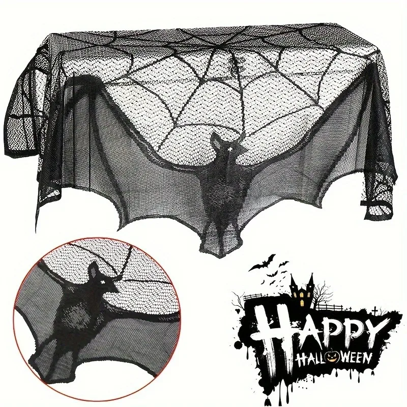 Halloween Lace Curtains, Black Bat Spider Tablecloth, Fireplace Scarf Cover, Halloween Home Room Spider Web Horror Decoration