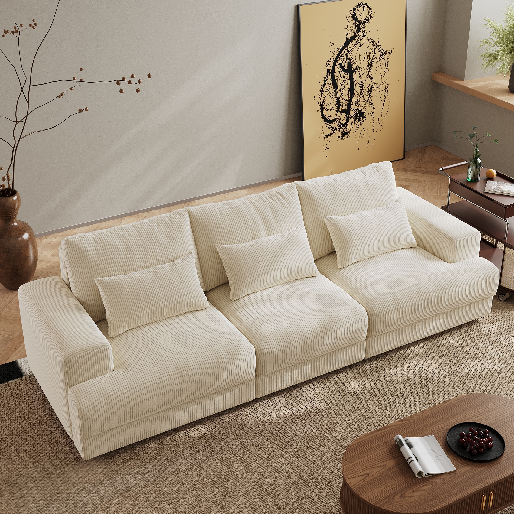 102" Fluffy Couch 3 Seats Sofa Set with 3 Couch Pillows, Living Room Sofa, Apartment, Bedroom, Corduroy, Beige