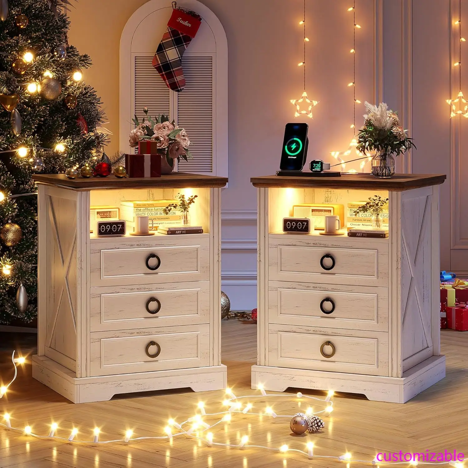 Nightstand Set 2 with Charging Station, Farmhouse End Side Table, Smart Bedside Table with LED Light & Human Sensor, White, Chest