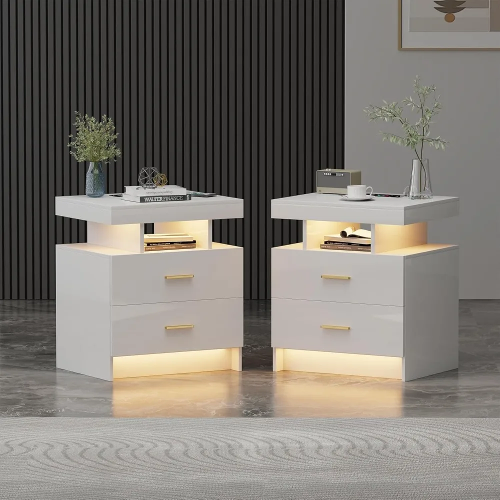 LED Nightstand 2 Set with Charging Station, High Gloss Bedside Table with 2 Drawers, 24 Color Dimmable Modern Smart Night Stand