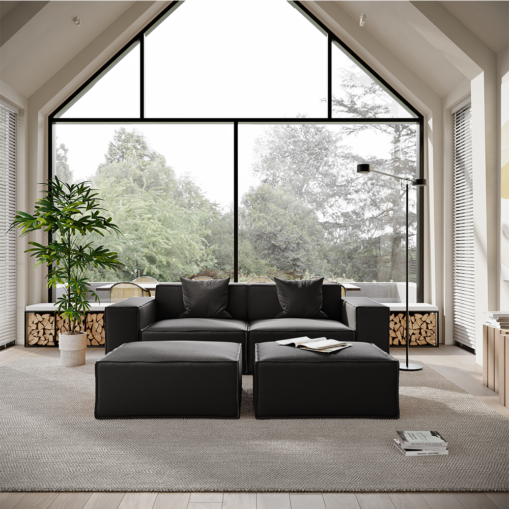 83.86" Minimalist Accent Chair with 2 Ottoman, Genuine Leather Sofa with Track Arm, Deep Seat Couch, Black