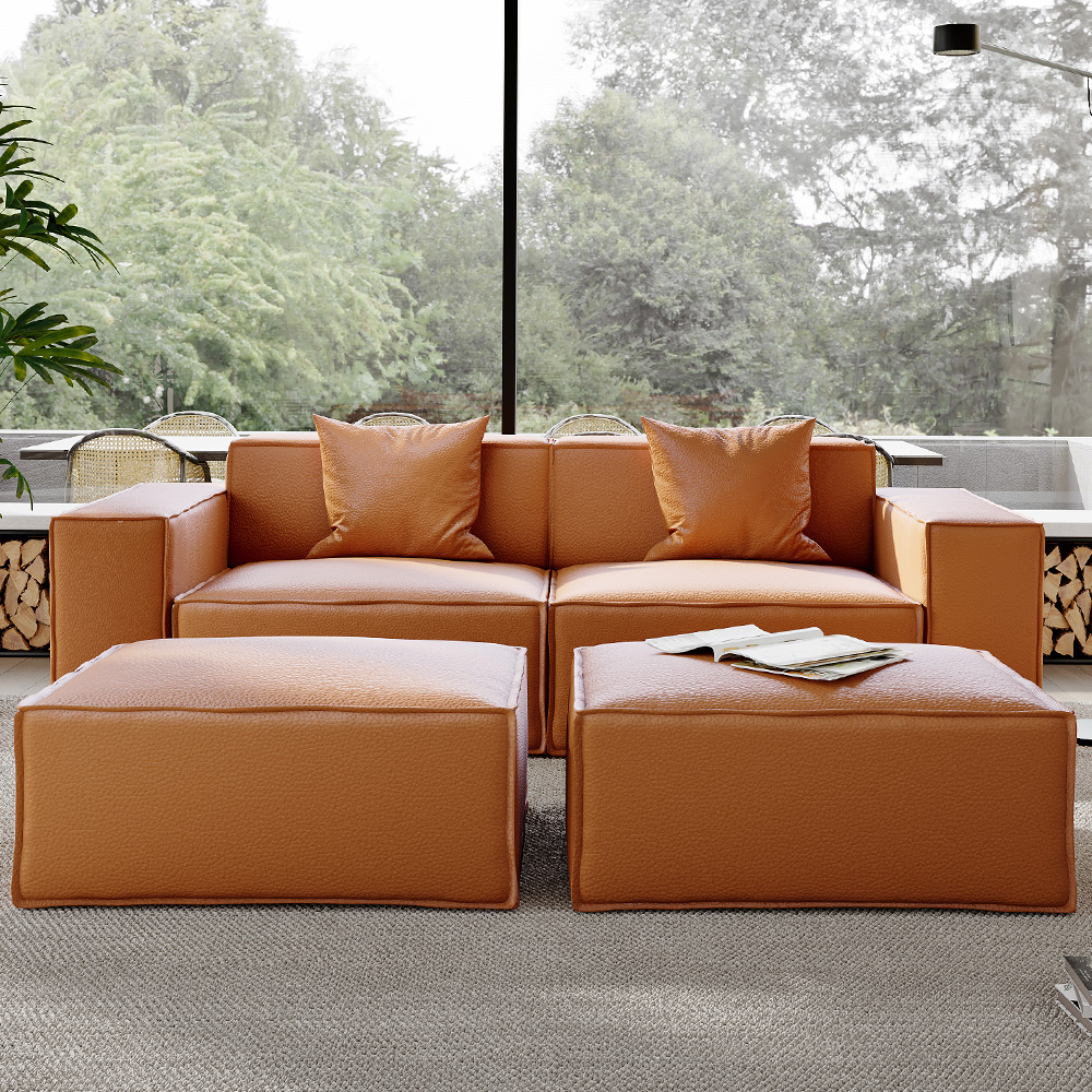 83.86" Minimalist Accent Chair with 2 Ottoman, Genuine Leather Sofa with Track Arm, Deep Seat Couch, Orange