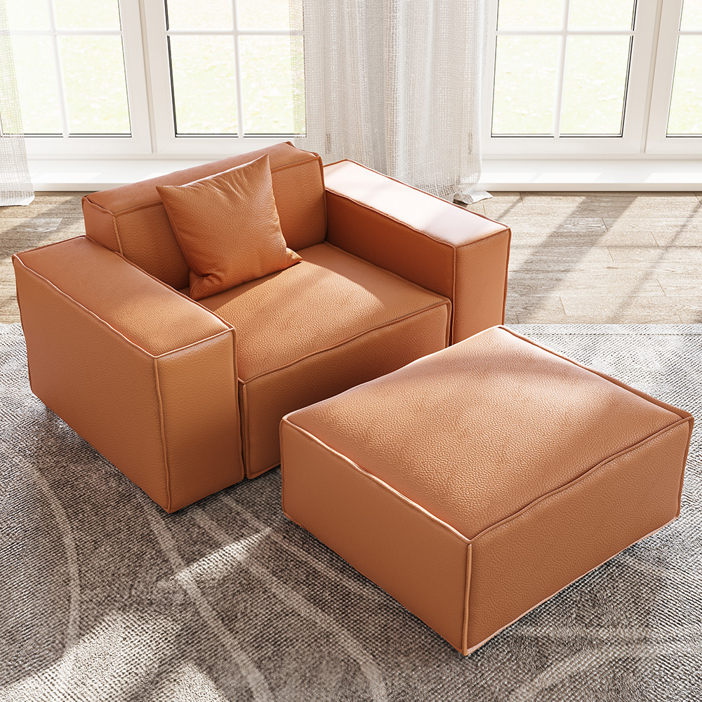 51.96" Minimalist Accent Chair with Ottoman, Genuine Leather Sofa with Track Arm, Deep Seat Couch, Orange