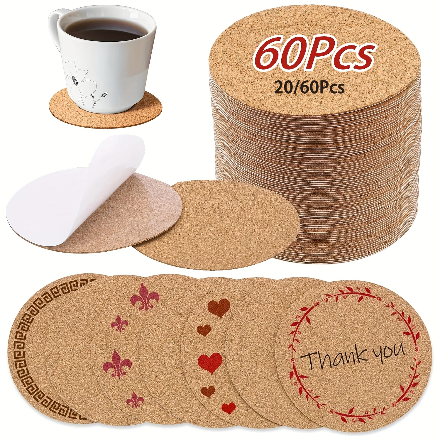 20-60Pcs Self-Adhesive Cork Sheets for DIY Coasters Round Backing Cork Tiles Mat Cork Coasters CorkBacking for Wall Decor Crafts