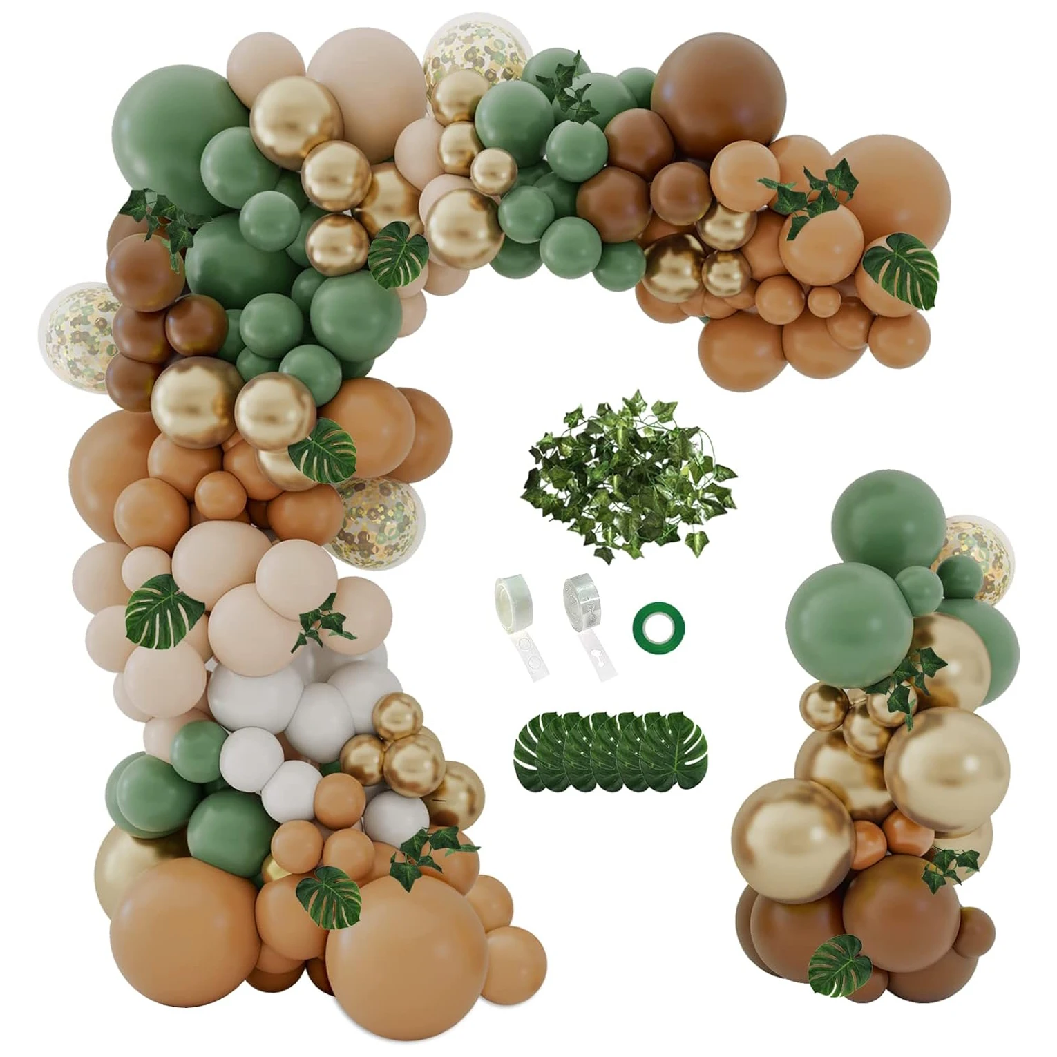 Forest wildlife balloon wreath arch set, 152pcs sage green gold with rattan palm leaves, birthday party baby shower decoration