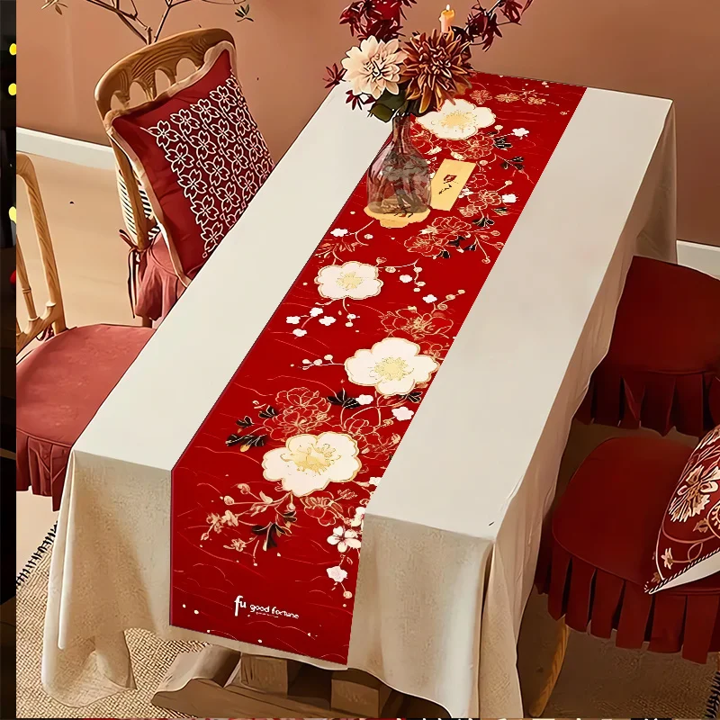 Chinese 2025 Happy New Year Printed Linen Table Runner Home Party Decor China Spring Festival Table Runners Dresser Scarf Decor