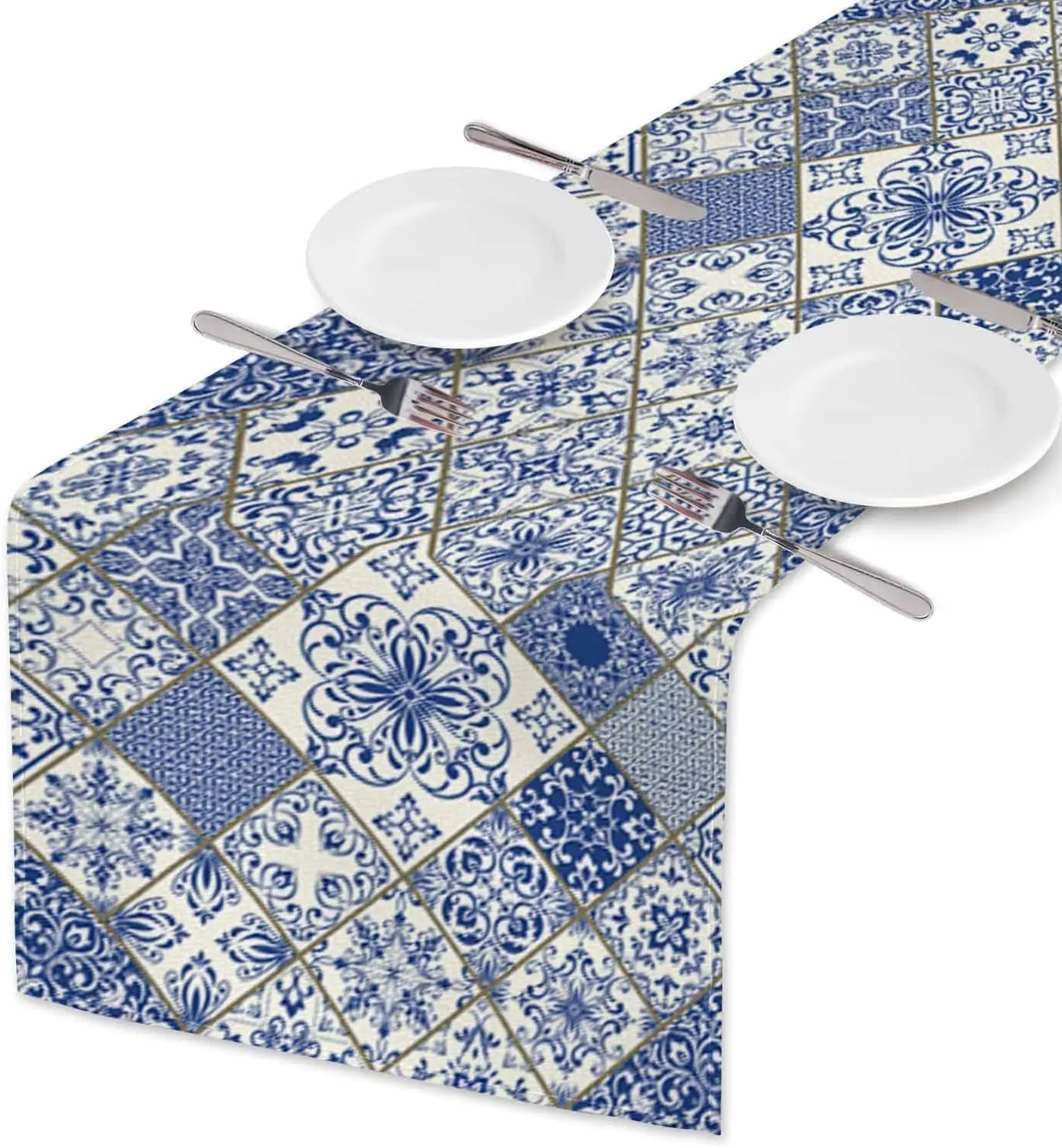 Blue White Patchwork Tile Linen Table Runner Dress Scarves Decor Farmhouse Kitchen Dining Table Runner Holiday Party Decorations