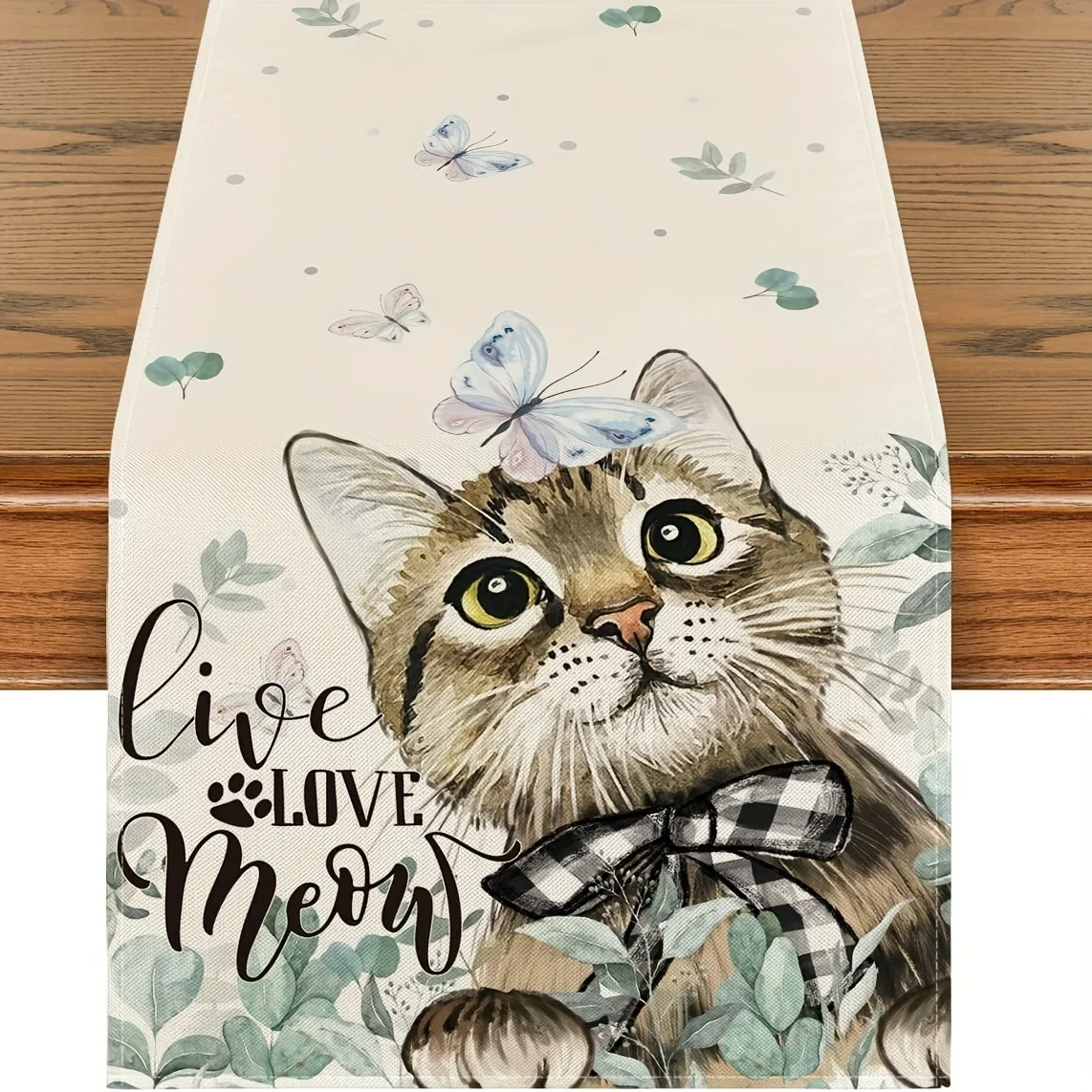 Spring Summer Cat linen Table Runner Floral Flower Eucalyptus Leaves Butterfly Kitchen Dining Table Decor Seasonal Home Decor