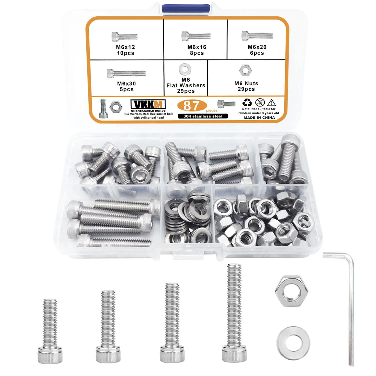87 Pcs of M6x12/16/20/30mm 304 Stainless Steel Hexagonal Socket Head Bolts, Nuts, Washers, Suitable for Mechanical Maintenance