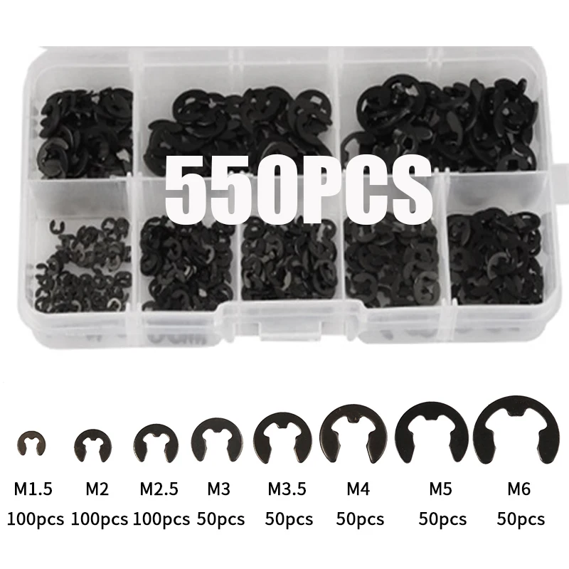 550pcs E Clip Snap Circlip Washer 65Mn Black Steel Shaft External Retaining Ring Washer for Shaft M1.5 M2 M2.5 M3 M3.5 M4 M5 M6