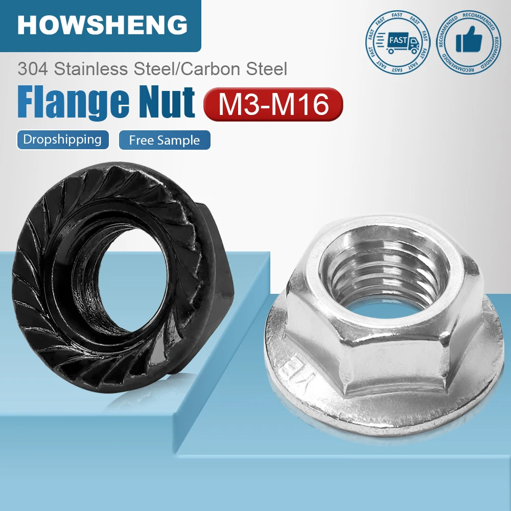 HOWSHENG 2-110pcs Hexagon Flange Nut M3 M4 M5 M6 M8 M10 M12 Stainless Steel Carbon Steel Hex Serrated Lock Flange Nut DIN6923
