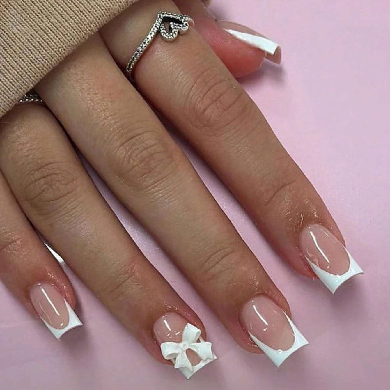 24pcs Medium Square White French Fake nails, Bow on nails Detachable And Reusable Jelly Glue 1pc Cuticle Pusher