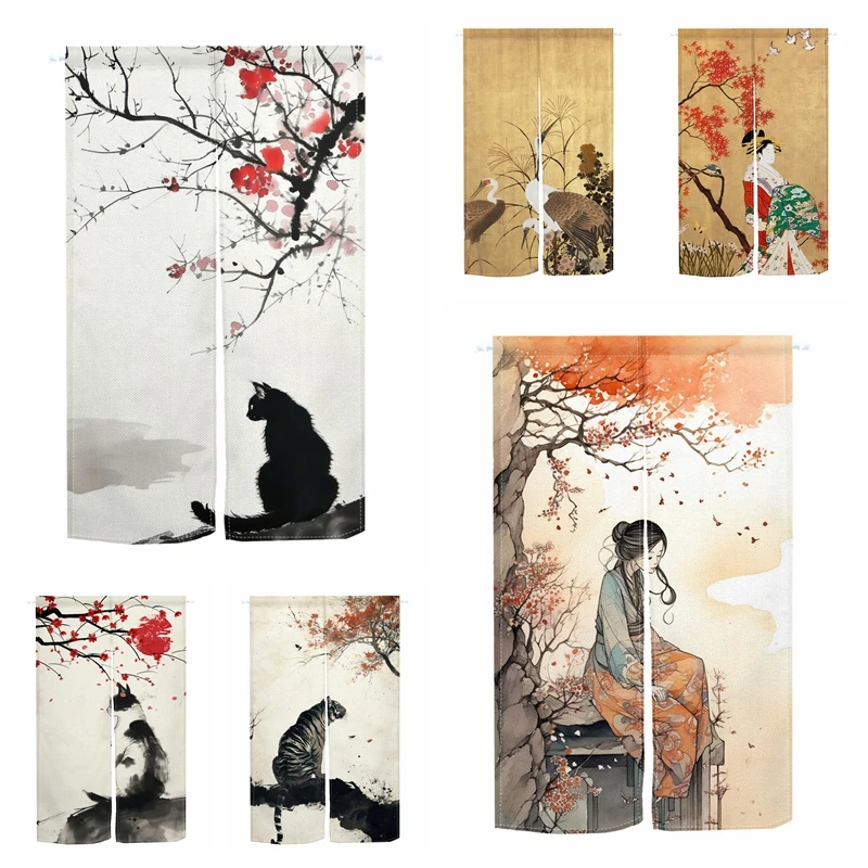 Japanese Noren Split Door Curtains Bird Flower Print Bedroom Traditional Pattern Partition Kitchen Linen Hanging Half Curtains