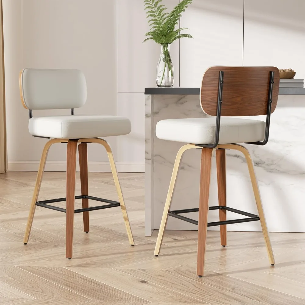 Swivel Bar Stools Set of 2, 26" Upholstered Faux Leather Counter Height Barstools with Walnut Back & Bentwood Legs, Mid Century