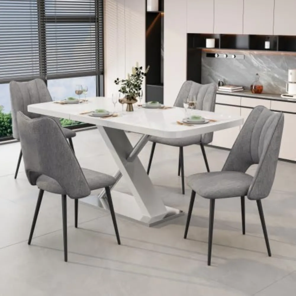 Contemporary 6-Piece Dining Set with White Faux Marble Rectangular Table, Upholstered Full Back Chairs, and Bench in Light Gray