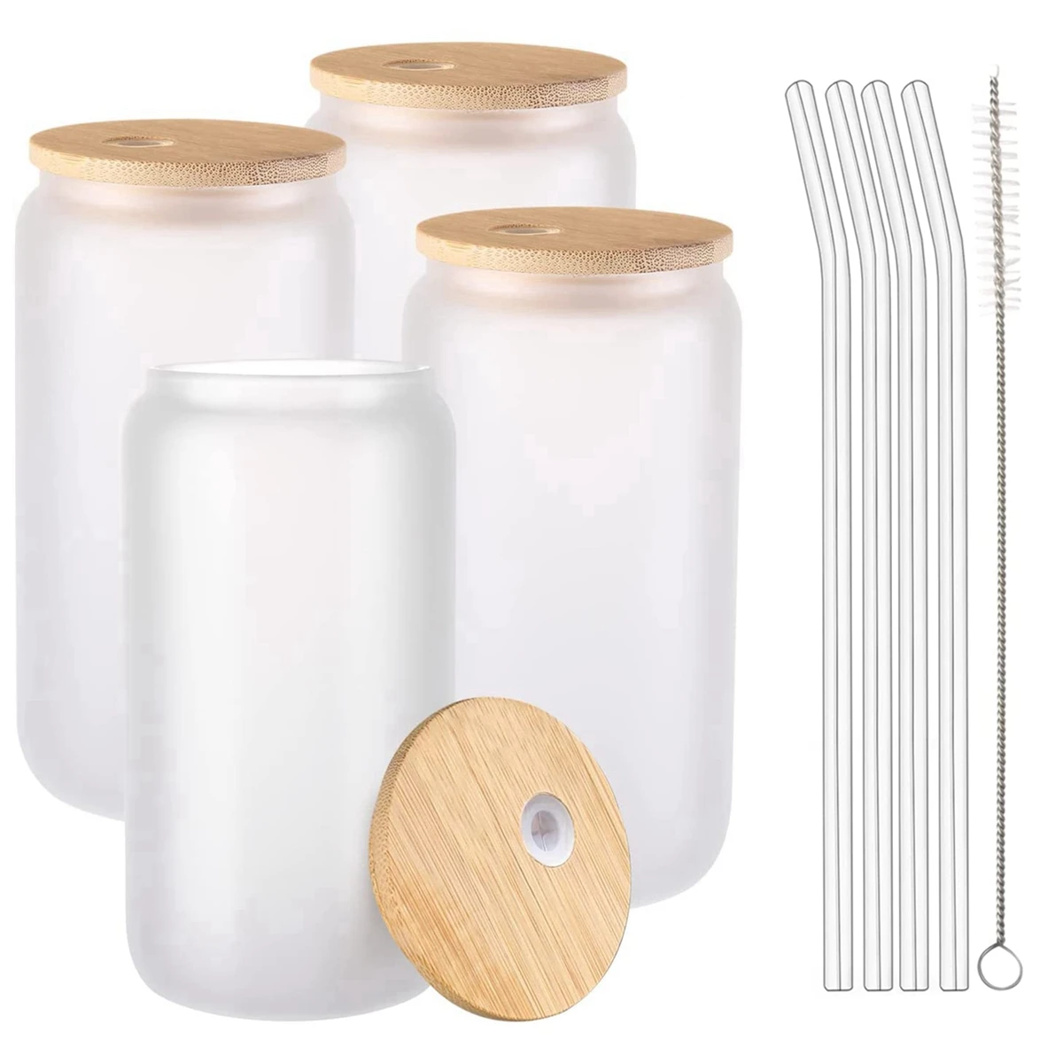 4Pcs Drinking Straw Cup with Bamboo Lids Set Reusable Beer Can Shaped Glasses for Tumbler Coffee Soda Juice Straws Glass Cup