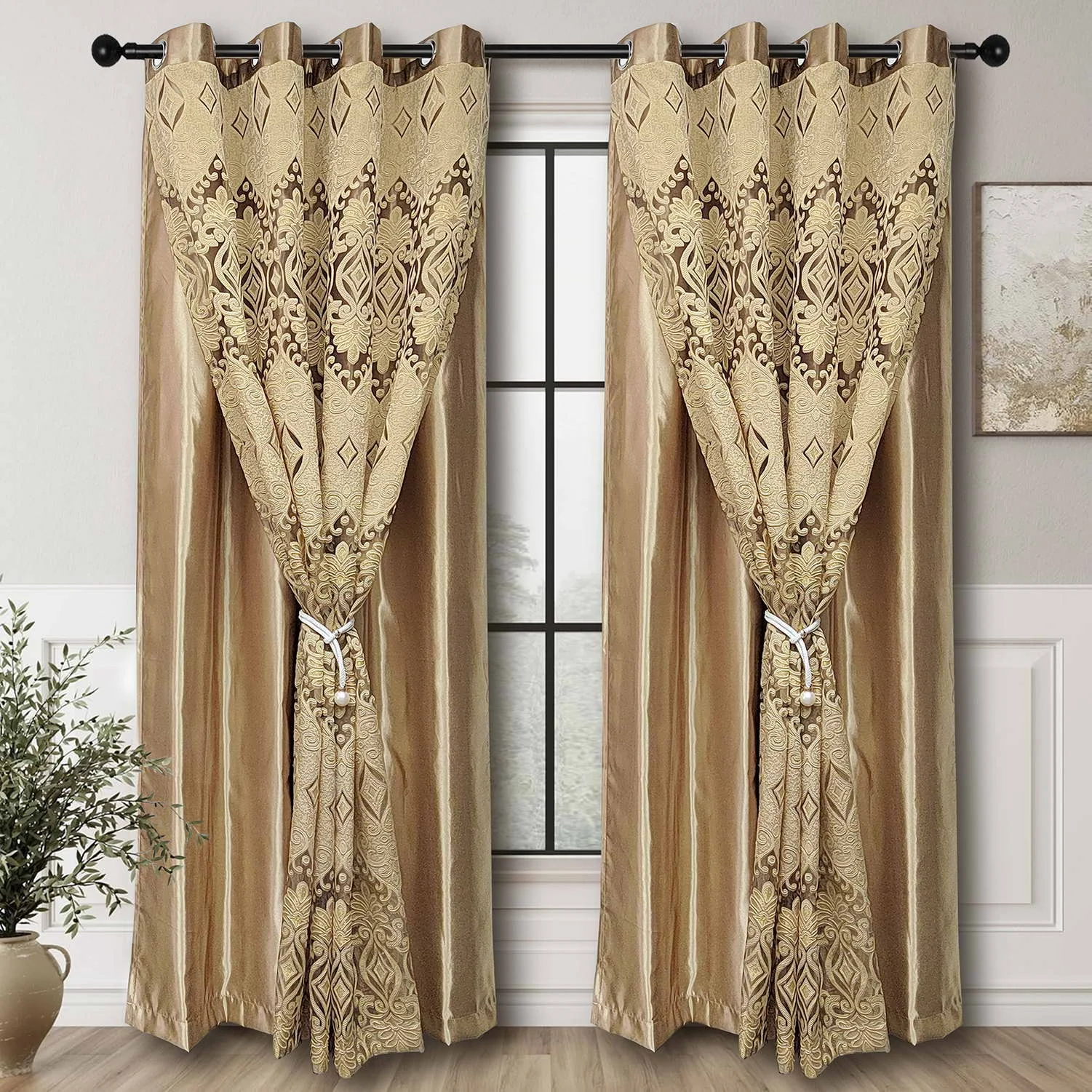 Golden Jacquard Double-Layer Curtains For Living Rooms And Bedrooms, Integrating Tulle and Blackout Curtains-Grommet top (Ring)