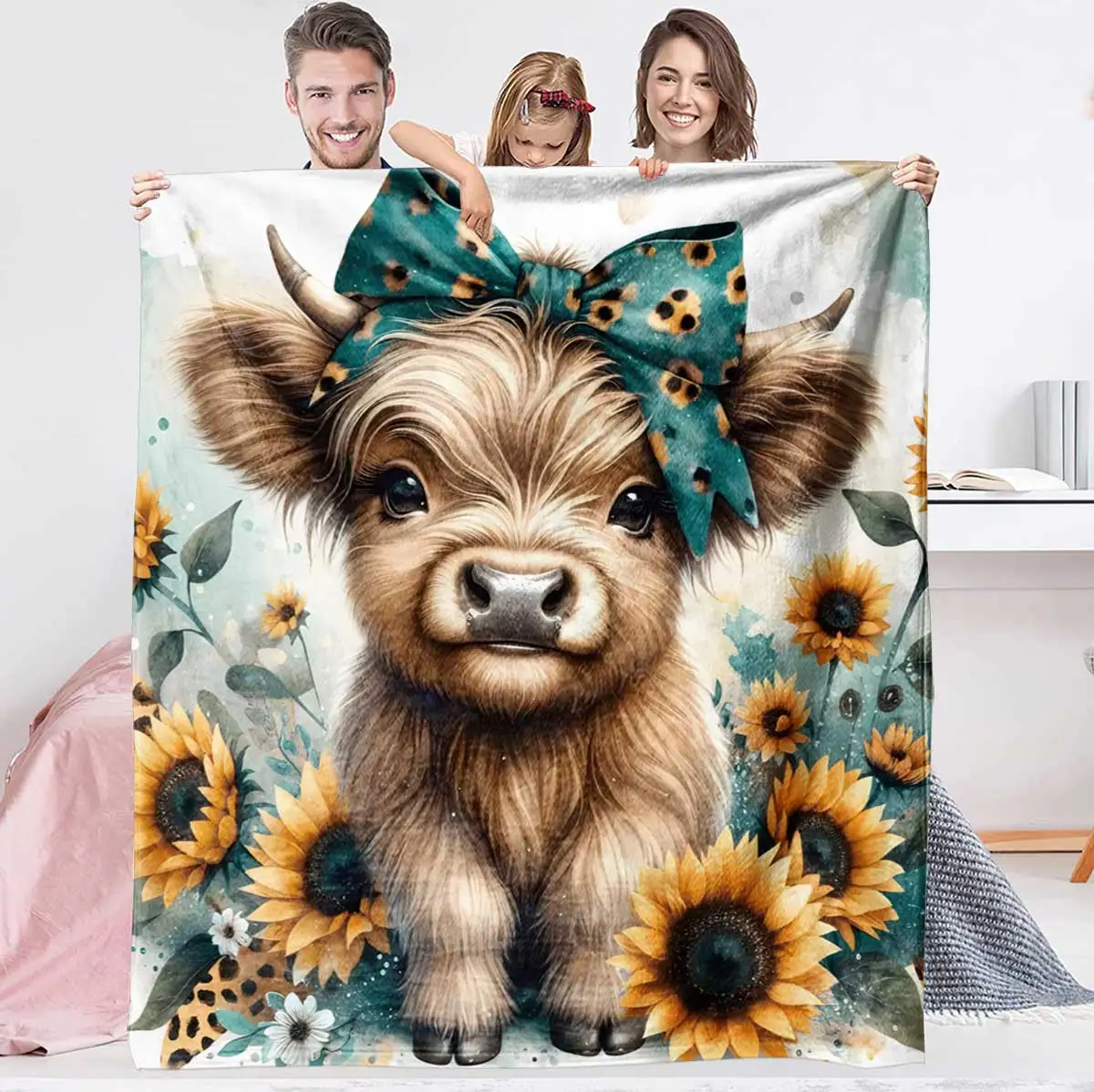 1pc Cartoon Highland Cow Print Flannel Blanket, Multi Size Living Room Sofa, Casual Nap Cover, Portable and Machine Washable