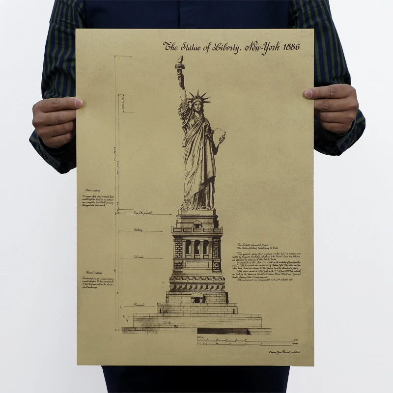 Bar Home Decor Vintage the Statue of Liberty in New York 1886 Design Drawings Poster Retro Kraft Paper 51x35cm Wall Sticker