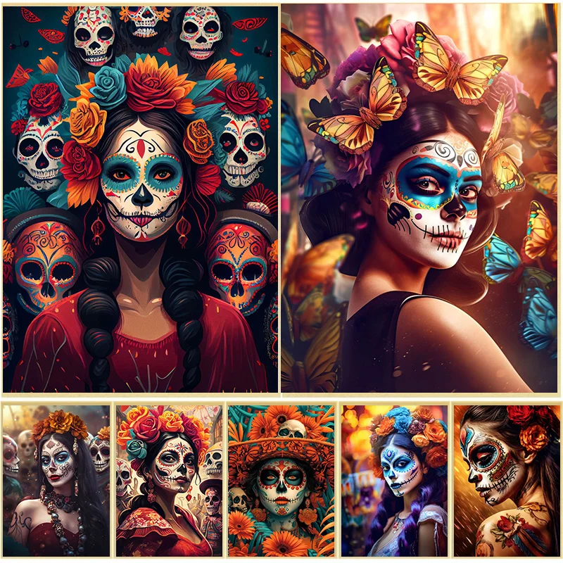 Festive and Mysterious Mexican Girl Day of Dead Gothic Sugar Skulls Canvas Painting Posters Prints Wall Art Picture Home Decor